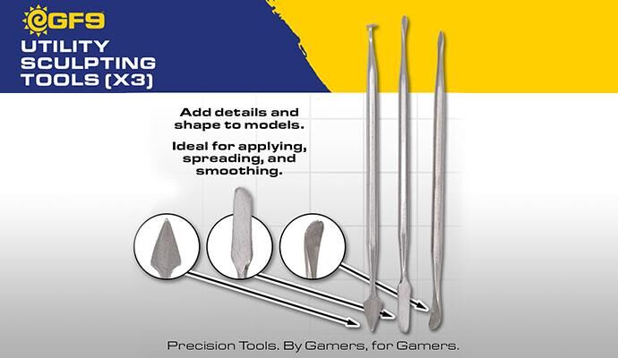 The Gale Force 9 Utility Sculpting Tools set contains three tools specifically designed for editing and sculpting miniatures and models. This set is an essential tool for hobbyists concerned with creating and customizing their miniatures world.