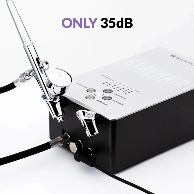 De compressor ondersteunt twee gelijktijdige airbrushes, wat ideaal is voor snelle kleurwissels of verschillende spuittechnieken zonder steeds om te bouwen.