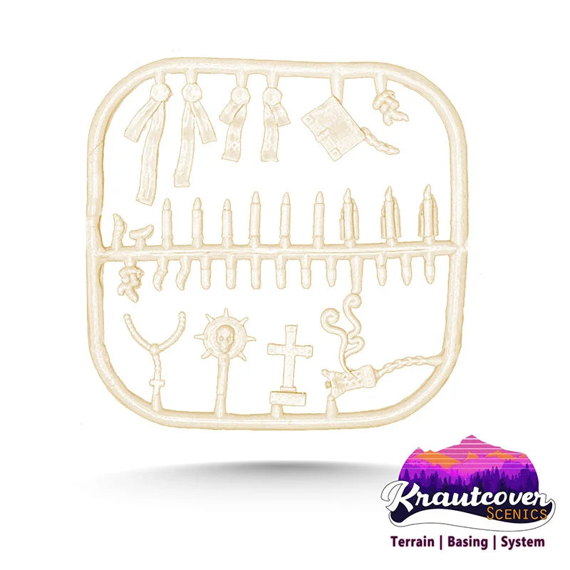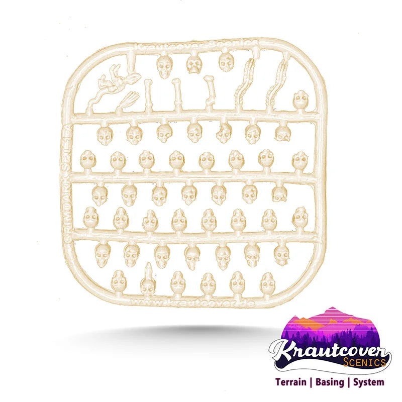 Das Kraut-Bitz Grimdark (KCS-5001) Set ist ein Kunststoff-Teileset, mit dem sich Bases, Gelände und Miniaturen im düsteren Grimdark-Stil gestalten lassen. Die präzisionsgespritzten Teile enthalten eine Vielzahl kleiner Elemente wie Schädel, Knochen und andere typische Grimdark-Objekte – ideal für Hobbyisten, die ihren Tabletop-Projekten mehr Charakter und thematische Details verleihen möchten.